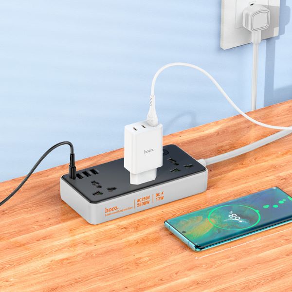 La regleta multifuncional HOCO (2500W) cuenta con una salida Type-C y 3 salidas USB-A para cargar múltiples dispositivos.